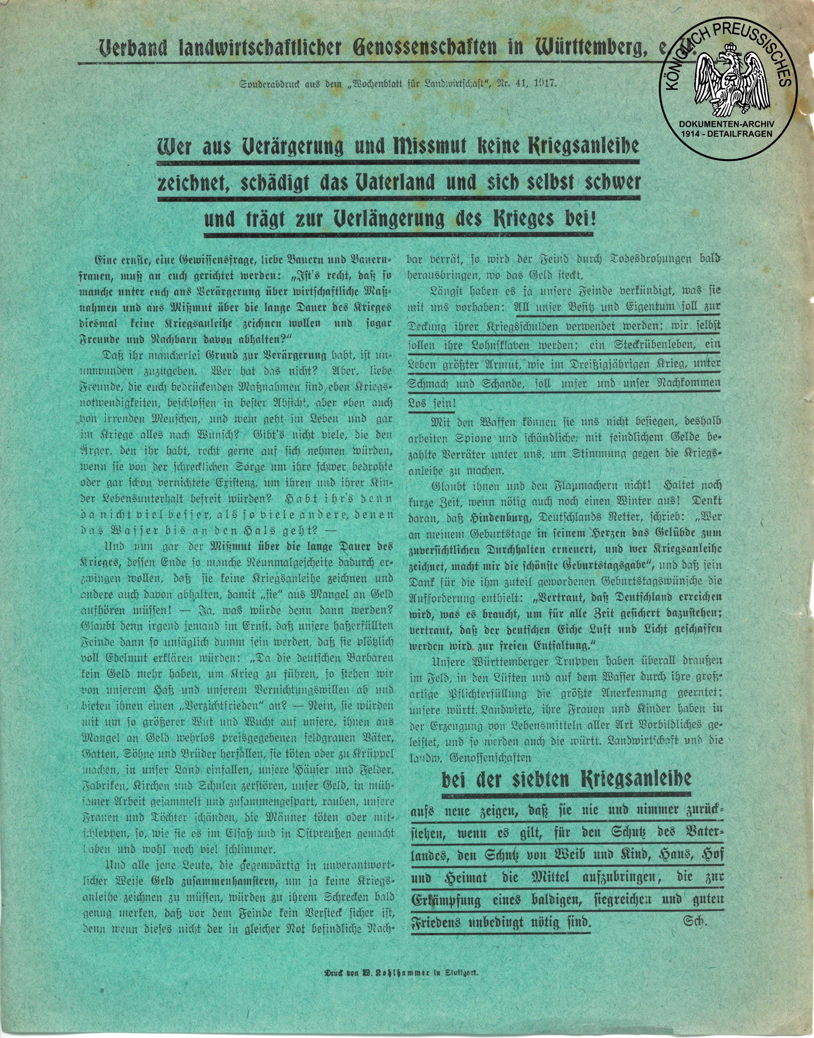 in Württemberg e.V." zur Zeichnung der 7. Kriegsanleihe.