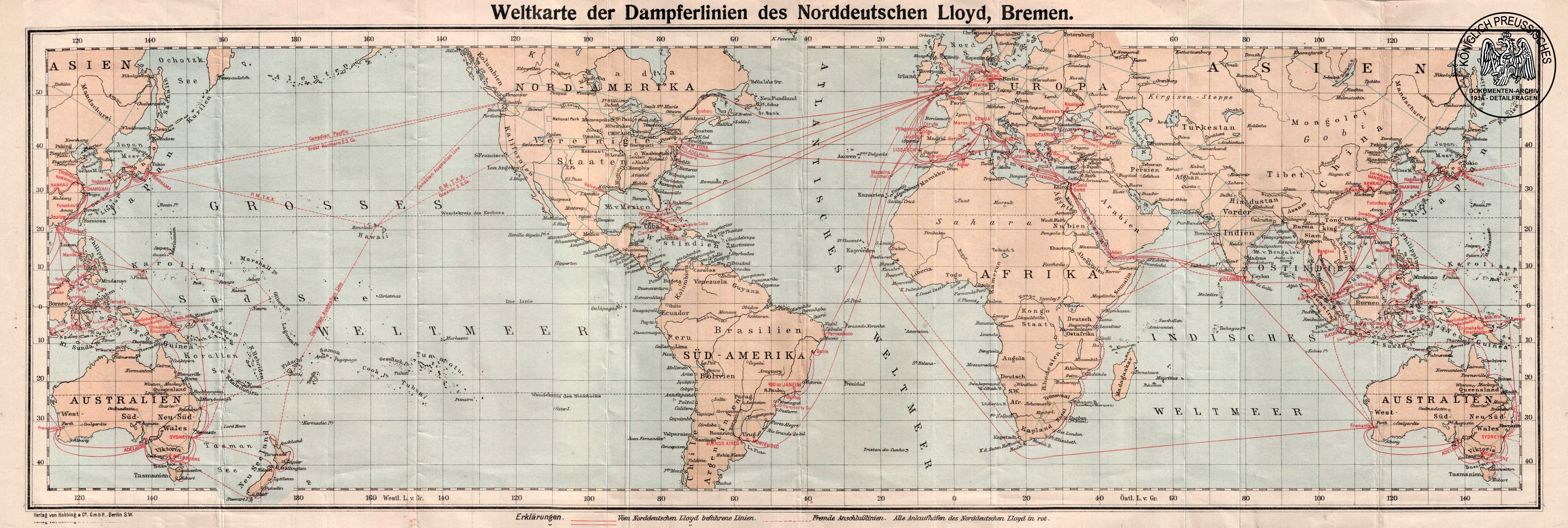 Weltkarte mit den Dampferlinien, die vom Norddeutschen Lloyd befahren wurden. Herausgegeben von Hobbing & Co., Berlin. |