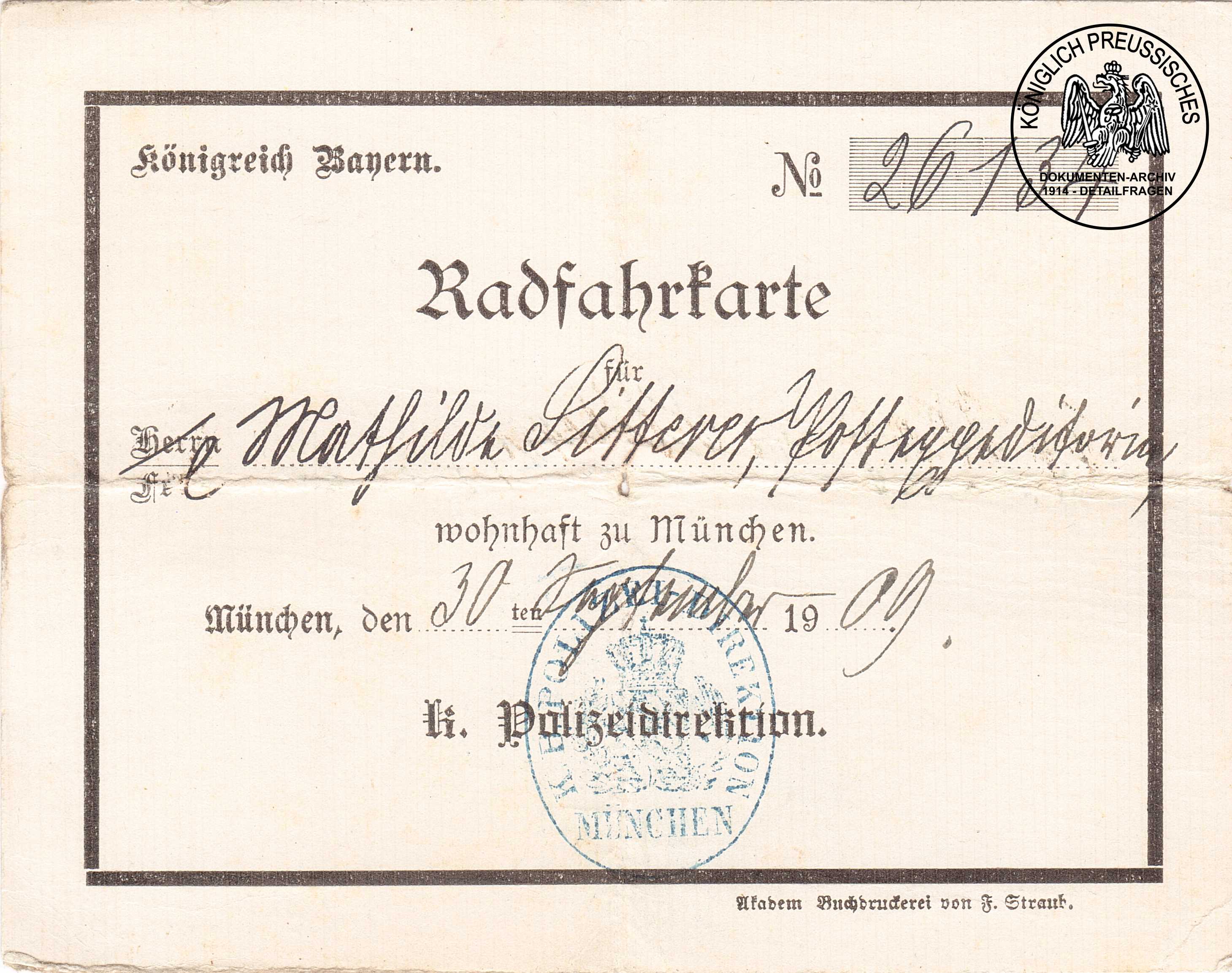 Radfahrkarte für Mathilde Litterer aus München. |