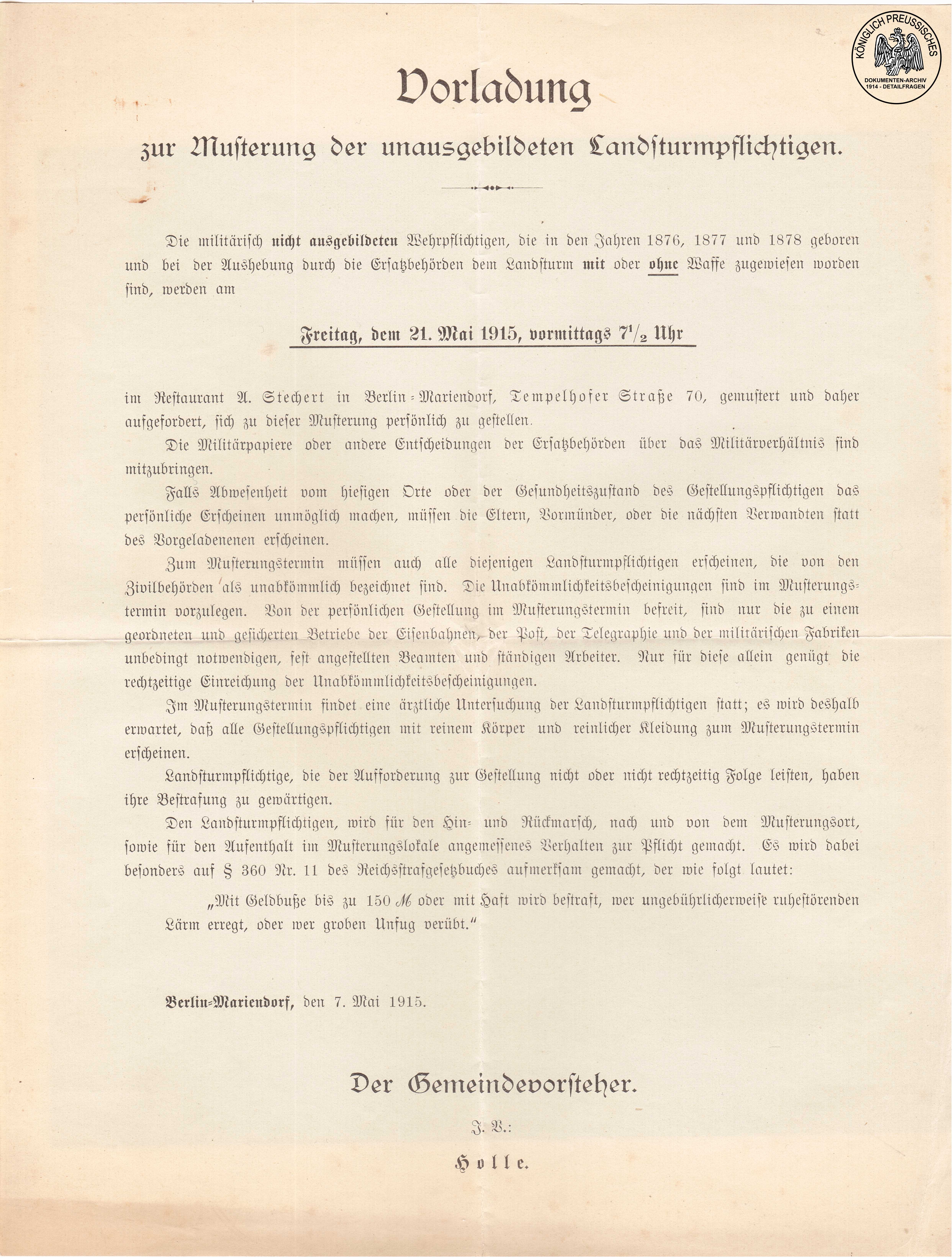 Vorladung zur Musterung der unausgebildeten Landsturm- Pflichtigen. |
